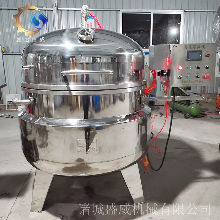 真空浸糖锅又名真空糖渍锅,适用于各种蜜饯、水果浸糖、酱菜迅速腌渍。如:红薯、大枣、蜜枣、山楂、蓝莓、草莓、苹果、梨、桃子等迅速浸糖,酱菜及休闲食品调料迅速腌渍入味,根据产量可配套抽空罐规格,罐体可以加装加温夹层,可安装温度自控系统;可配套气动开盖装置。真空浸糖锅以有压力的蒸汽为热源,真空浸糖锅具有受热面积大、热效率高、加热均匀、沸腾时间短、加热温度容易控制、方便清洗、真空度高等特点。
